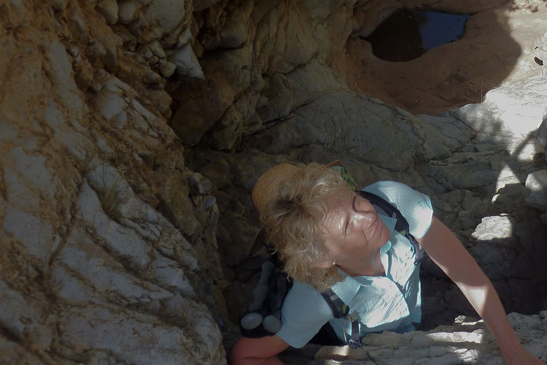 Vom (01) Start und Ziel (365 m) laufen wir auf der Asphaltstraße Richtung Kritina bis in die Linkskurve und steigen, hier rechts hinter der Leitplanke, in die Schlucht hinein. Es folgt der erste Höhepunkt, die Schlucht verengt sich und wir steigen über stufenförmig geschichtete Gesteinsschichten und erreichen eine erste Gumpe.