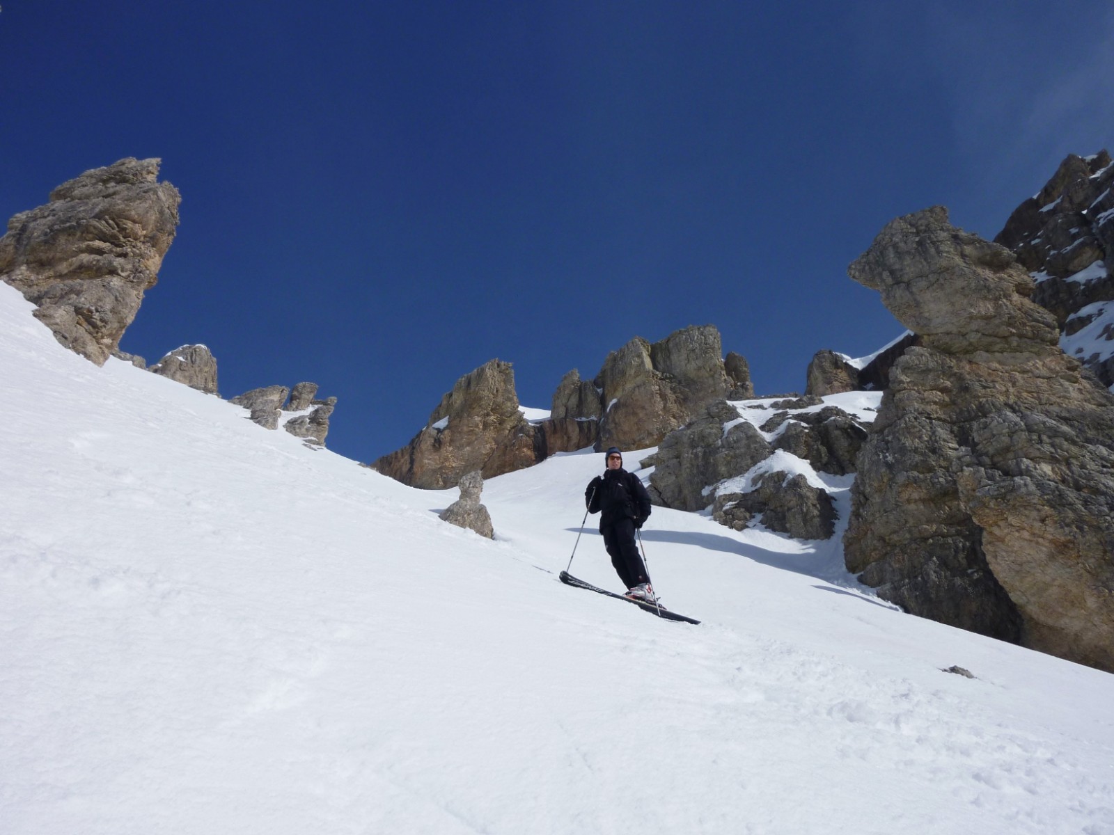 Vor uns liegt eine hervorragende Variantenabfahrt zwischen den Spitzen der Lagzuoi Torries, die bei Firnschnee, wie an unserem Tag, ein großartiges Erlebnis ist. Am unteren Ende treffen wir auf eine Forststraße.