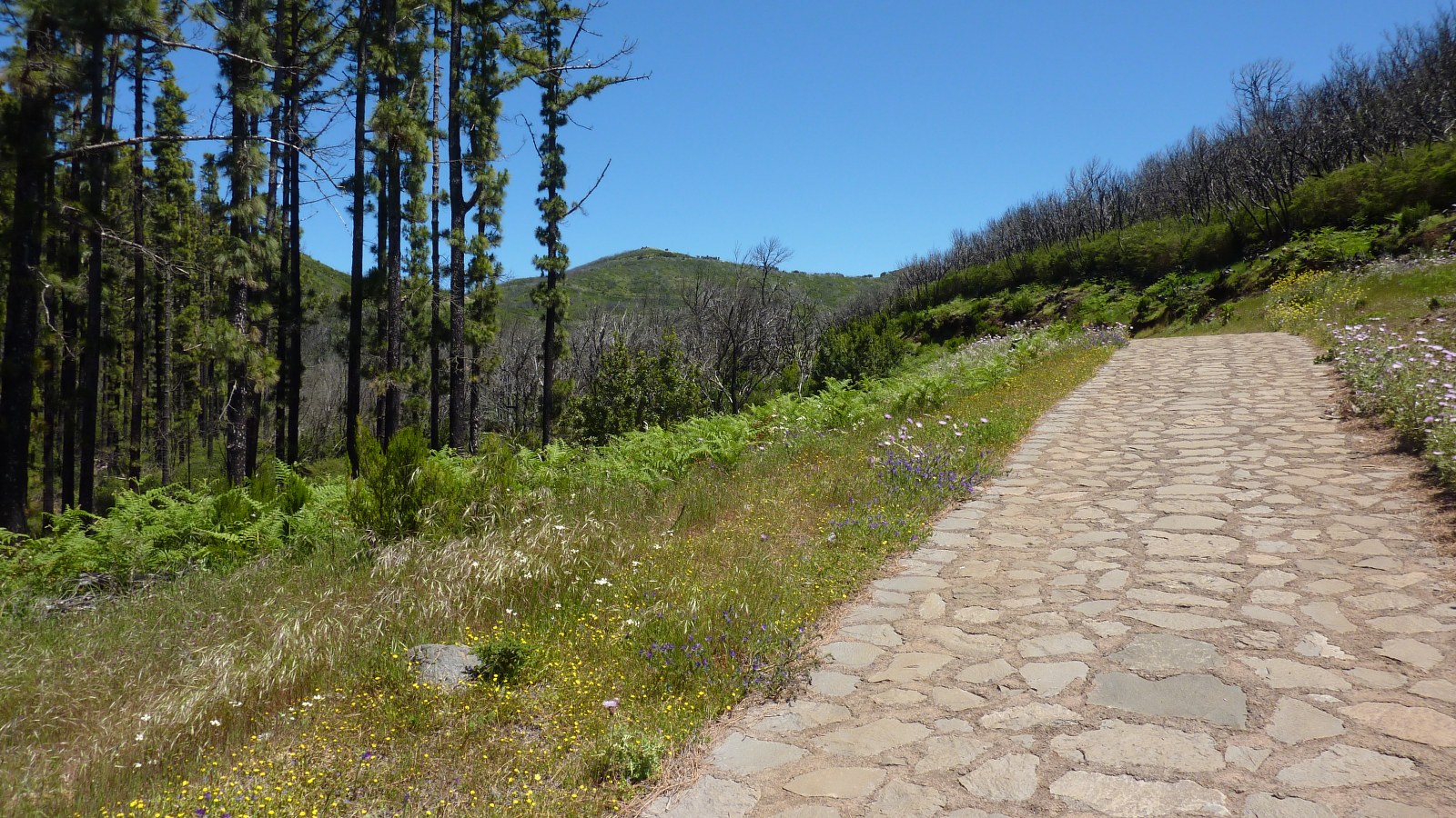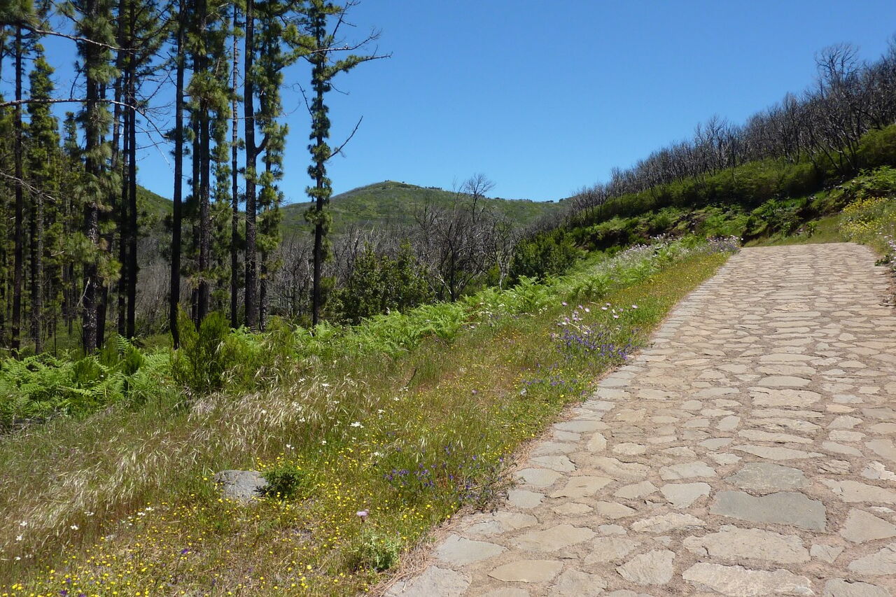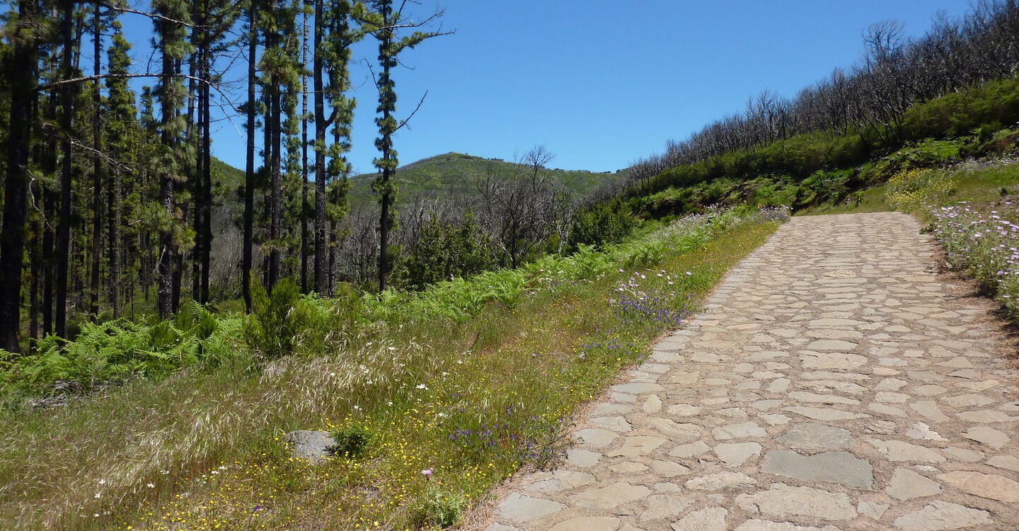 Vom (01) Start und Ziel El Contadero (1362 m) beginnt auf der gegenüberliegenden Seite des Parkplatzes der gepflasterte Weg Richtung Alto de Garajonay. Nach 120 m verlassen wir diesen Weg nach rechts, Richtung Laguna Grande.