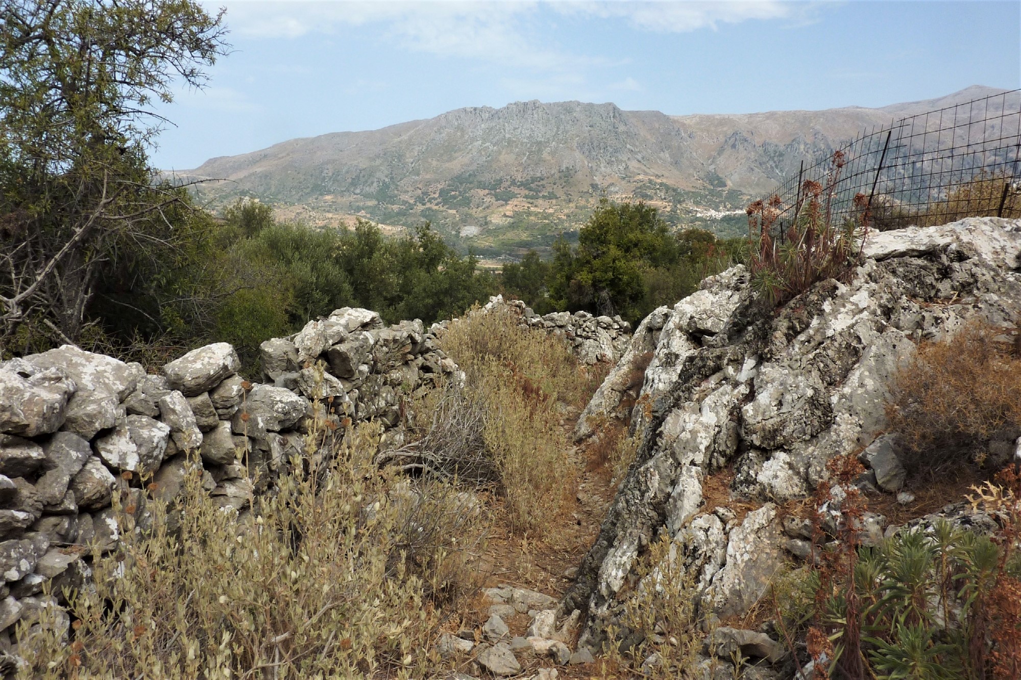 An der Weggabelung gehen wir halb links weiter, anschließend bei der nächsten Möglichkeit rechts, um nun parallel zum Wasserreservoir zu laufen. An dessen Ende bei der Weggabelung halten wir uns halb links. Nach 460 m überqueren wir eine Brücke nach links und erreichen das Dorf Lampiotes. Dort bleiben wir bei dem ersten Verkehrsspiegel auf der Hauptstraße und bei dem zweiten Verkehrsspiegel gehen wir geradeaus weiter. Nach 2,5 km erreichen wir einen Eichenwald, von links mündet eine Piste auf den Hauptweg – unser weiterer Weg, wenn wir nicht die Exkursion zum 02 palastartigen Komplex (352 m) machen. Nach weiteren 70 m gehen wir halb rechts auf dem mit einem roten Punkt markierten Pfad. Wir kommen an einer Quelle vorbei und gehen rechts durch das Dorf Monastiraki, um dann bei dem blau-grün gestrichenen Geländer rechts hinunter zu den Ruinen eines minoischen Palasts aus der Zeit von 1900 bis 1700 vor Christi zu gehen. Achtung! Die Anlage ist montags geschlossen.