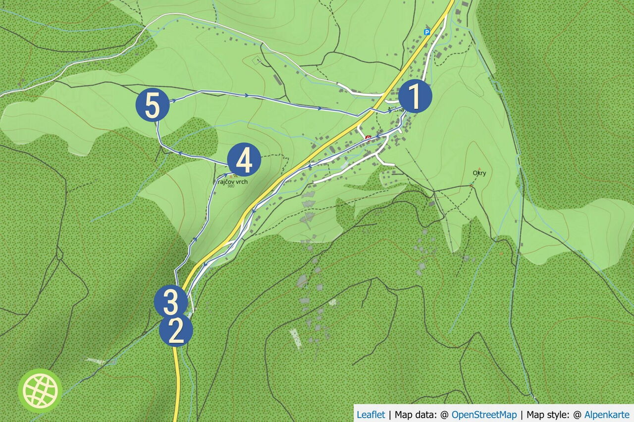 Kurz vor einer vereinzelten Feldscheune folgen wir dem rechten 03 Abzweiger (969 m) talwärts. Im Tal sehen wir die Kirchturmspitze des Dorfes Nižná Boca. Bei dem braunen Haus, der Bushaltestelle, überqueren wir die Hauptstraße nach links und folgen dem weiterführenden Pfad, um an der sofort folgenden Weggabelung halb links zu gehen.