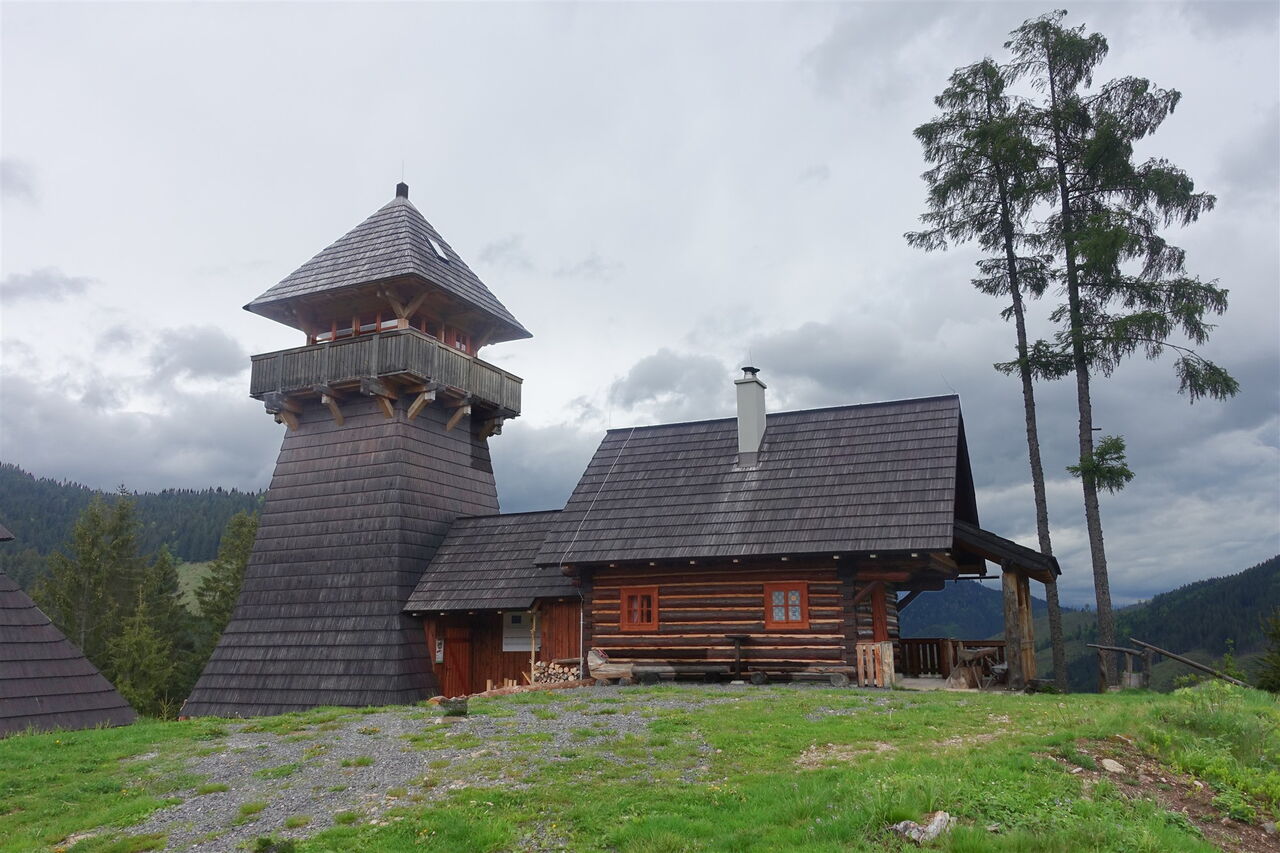 Nach kurzem Aufstieg sieht man bereits in der Ferne den Aussichtsturm 02 Rozhľadňa na Krajčovom vrchu (980 m). Nach einer Besichtigung gehen wir von dort auf einer Piste in westliche Richtung, rechts vorbei an drei verfallenen Ställen, wie sie überall auf den umliegenden Wiesen verstreut liegen – sie gehören zu den Besonderheiten der Region.