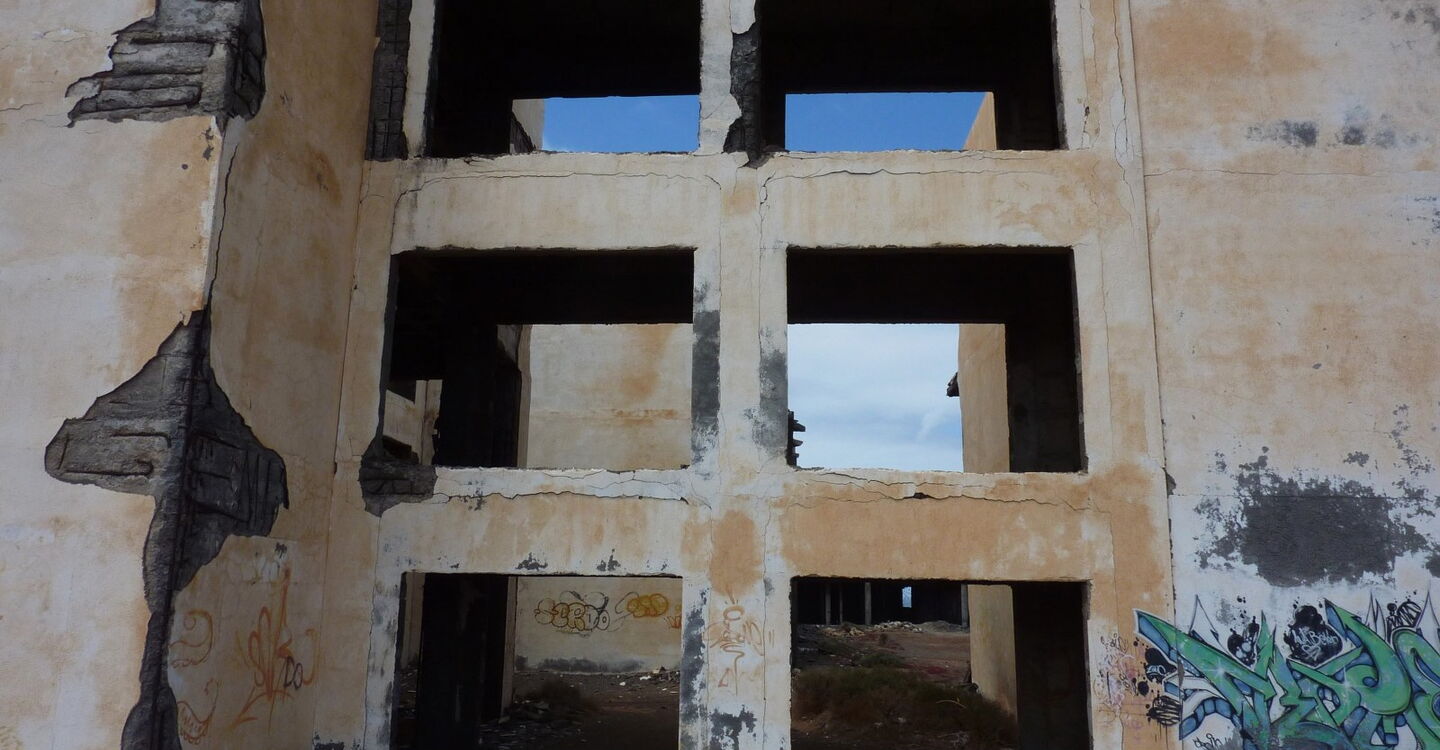 Immer deutlicher lässt sich am Horizont die (03) Bauruine (26 m) des geplanten Hotels Atlante del Sol erkennen, auf die wir nun direkt zusteuern. Bei den Vulkanausbrüchen der Neuzeit erschuf die Natur eine bizarre Mondlandschaft. In den siebziger Jahren verwüsteten Immobilienspekulanten und Baulöwen vieles, was die Natur zuvor noch verschont hatte. Neben diesem Zeitzeugen werden wir am Playa Blanca sehr viele weitere leer stehende Apartmentanlagen und Bauruinen antreffen.