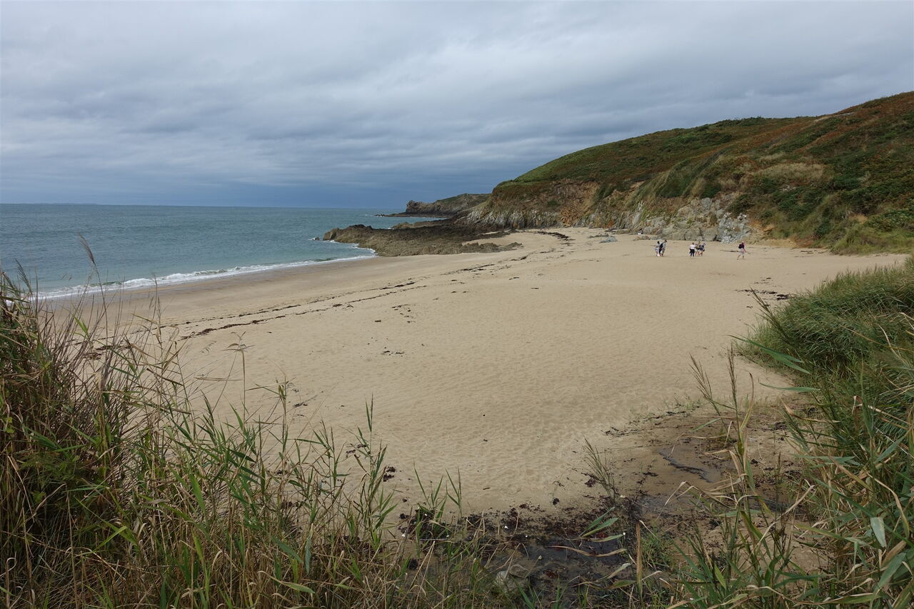 Nachdem wir die Pointe de la Mouliére hinter uns gelassen haben, erreichen wir den schönsten Strand auf der heutigen Wanderung, den 05 Plage du Verger (7 m) – ein 700 m langer und bei Ebbe 150 m breiter feiner Sandstrand. Auf dem Küstenpfad verlassen wir den Strand und erreichen einen Parkplatz. Dann setzen wir unsere Wanderung auf der nachfolgenden Straße bis zur Chapelle du Verger fort. Wir gehen rechts an der Kapelle vorbei und danach rechts auf einem Wirtschaftsweg weiter. Schließlich laufen wir direkt auf ein Haus zu, aber kurz vor dem Haus halten wir uns rechts. Sobald wir parallel zu einer etwas oberhalb liegenden Piste gehen, machen wir eine 180°-Kehrtwendung und folgen nun dieser Piste, die im weiteren Verlauf durch eine Senke, eine Linkskehre und eine Rechtskehre führt. Auf der Straße gehen wir bis zu deren Ende, dann gerade über die Straße und nehmen anschließend den weiterführenden Pfad. An dessen Ende gehen wir rechts und erreichen den Ausgangspunkt.