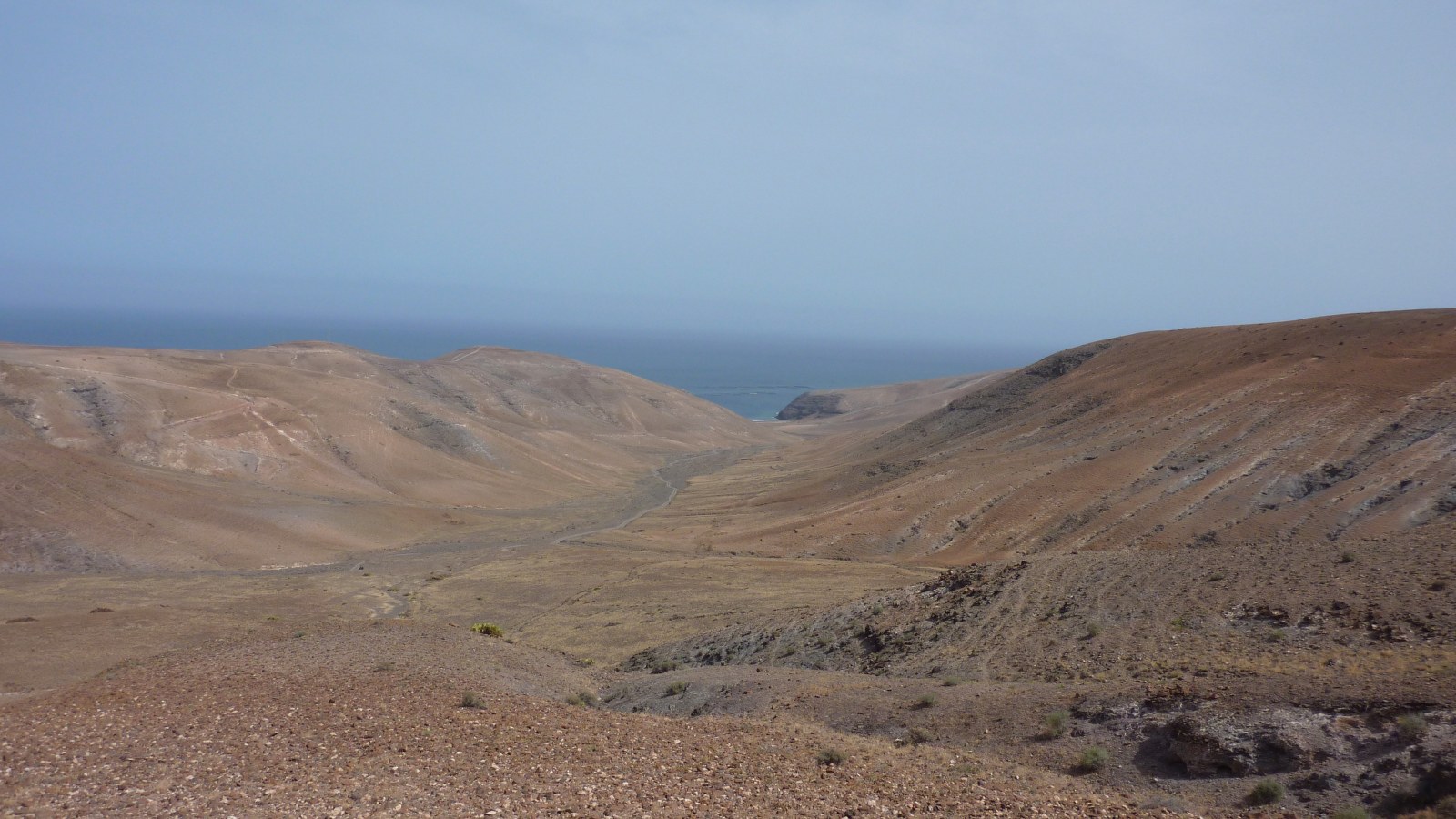 Wir haben das (02) Barranco de la Higuera (118 m) erreicht, einen der bedeutendsten Wasserläufe im Ajaches-Gebirgsmassiv. Sein Ursprung befindet sich zwischen den Erhebungen Pico Redondo und Loma Pico de la Aceituna. Es wird wieder ein Pfad erkennbar, dem wir fortan Richtung Meer folgen.