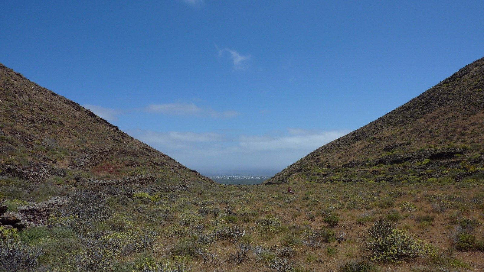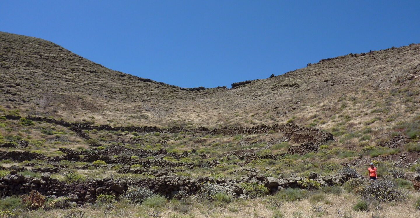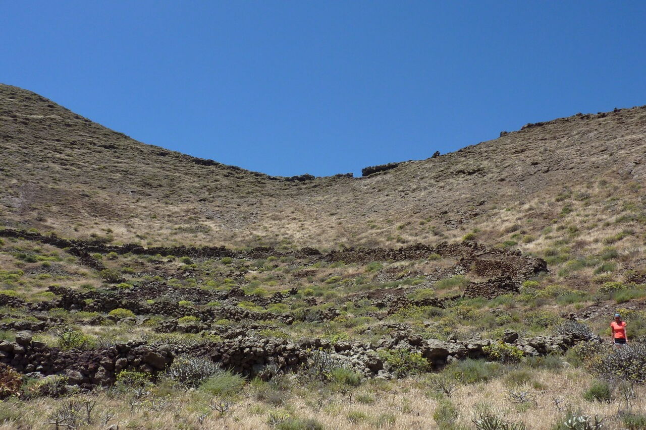 Die Schotterstraße macht eine scharfe Linkskurve und nach 120 m geht es vorbei an der links von uns liegenden Ruine. Noch vor dem Barranco gehen wir rechts und für kurze Zeit weglos auf die nordöstliche Öffnung des Vulkankraters zu. Wenig später ist wieder ein Pfad zu erkennen. Bei einem Durchbruch passieren wir eine Steinmauer. Nachdem wir den Vulkangrund halb rechts durchschritten haben, gehen wir an der hohen Steinmauer entlang. Der Weg ist nicht immer eindeutig ersichtlich. Hinter der Steinmauer beginnt ein Pfad, auf dem wir bis zu einem gut sichtbaren (03) Felsdurchbruch (300 m) aufsteigen.