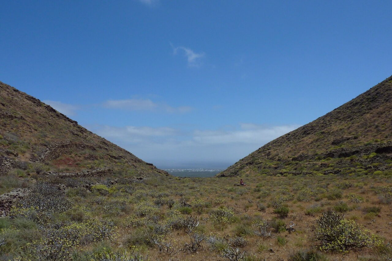 Von der (01) Bushaltestelle (97 m) bzw. dem Parkplatz geht es rechts in die Calle Sta. Margarita, die in westliche Richtung führt. Wir treffen auf eine Stichstraße und gehen dort rechts und bei der nächsten Möglichkeit erneut rechts auf die LZ-405/Calle Tarajal. Danach führt eine Asphaltstraße links bergauf, vorbei an einen rechts liegenden Friedhof, gerade auf ein Wasserreservoir zu. Hier können wir entweder der Asphaltstraße in einer großen Linkskehre weiter folgen oder über einen schmalen Pfad bergauf abkürzen, der direkt neben dem Wasserreservoir beginnt.