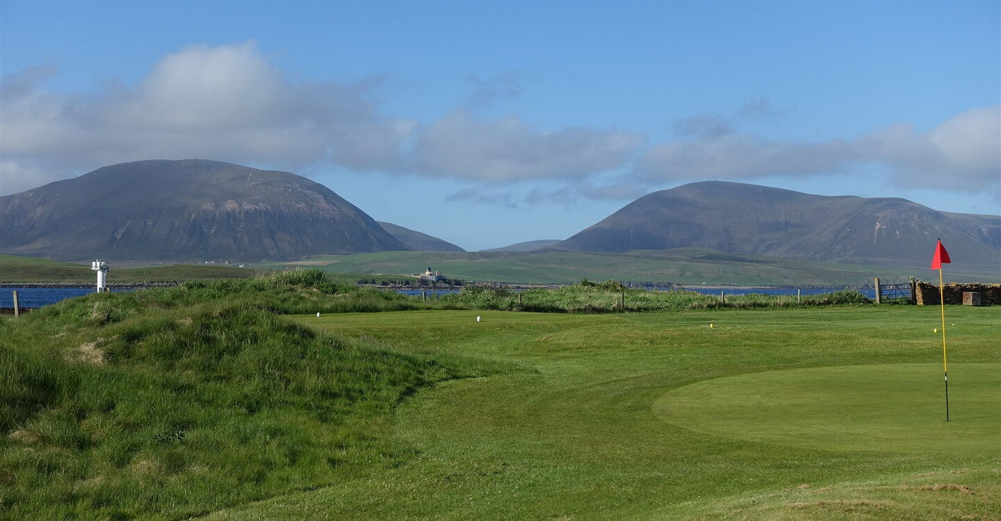 Nachdem wir ein gutes Stück vorangekommen sind, sehen wir rechts unterhalb die Bucht mit dem 05 Rackwick Beach (134 m). Wir gehen in Richtung einzelner Häuser im Landesinneren und nicht rechts bergab. Sobald wir die Straße erreicht haben, gibt es die Möglichkeit – wie in der Variante beschrieben –, mit einem Shuttlebus zurückzufahren. Die Straße mündet in eine weitere Straße und direkt hinter einer kleinen Brücke biegen wir links auf den angelegten Pfad ab. Dieser zieht sich durch ein Tal zwischen dem links liegenden Berg Cuilag und dem mit 479 m höchsten Berg der Insel, dem Ward Hill. Am Ende des Weges erreichen wir den gestauten See und gehen auf dem bekannten Hinweg zurück zum Fähranleger.