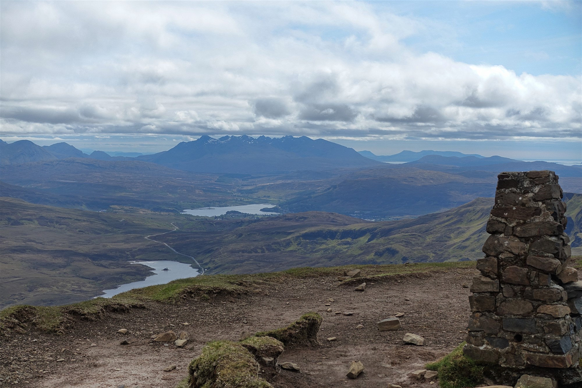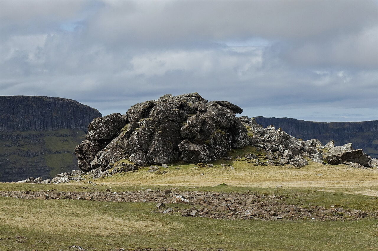 Dort angekommen, schauen wir in östliche Richtung in ein Kar herunter, in dem sich der 05 Loch Coire nan Grunnd (327 m) befindet. Bei guter Sicht orientieren wir uns in Richtung eines großen Felsens vor dem Loch, an dem mehrere kleine Bachläufe zusammenlaufen. Bei Nebel kann man sich auf diesem weglosen Stück nur mittels eines GPS-Tracks orientieren. Weiterhin weglos gehen wir etwas erhöht rechts an dem Loch vorbei und steigen dahinter zu einer sehr kleinen Einsattelung auf. Dort queren wir den Hang nach halb rechts in Richtung der weißen Sandstrände auf der Nachbarinsel Eigg. Wir erreichen eine platt geschliffene Steinfläche, die wie ein Helikopterlandeplatz aussieht. Von dort aus sieht man etwas tiefer gelegen einen Zaun verlaufen, zu dem wir absteigen, bevor wir links 5,2 km dem Pfad bis zum Fähranleger folgen.