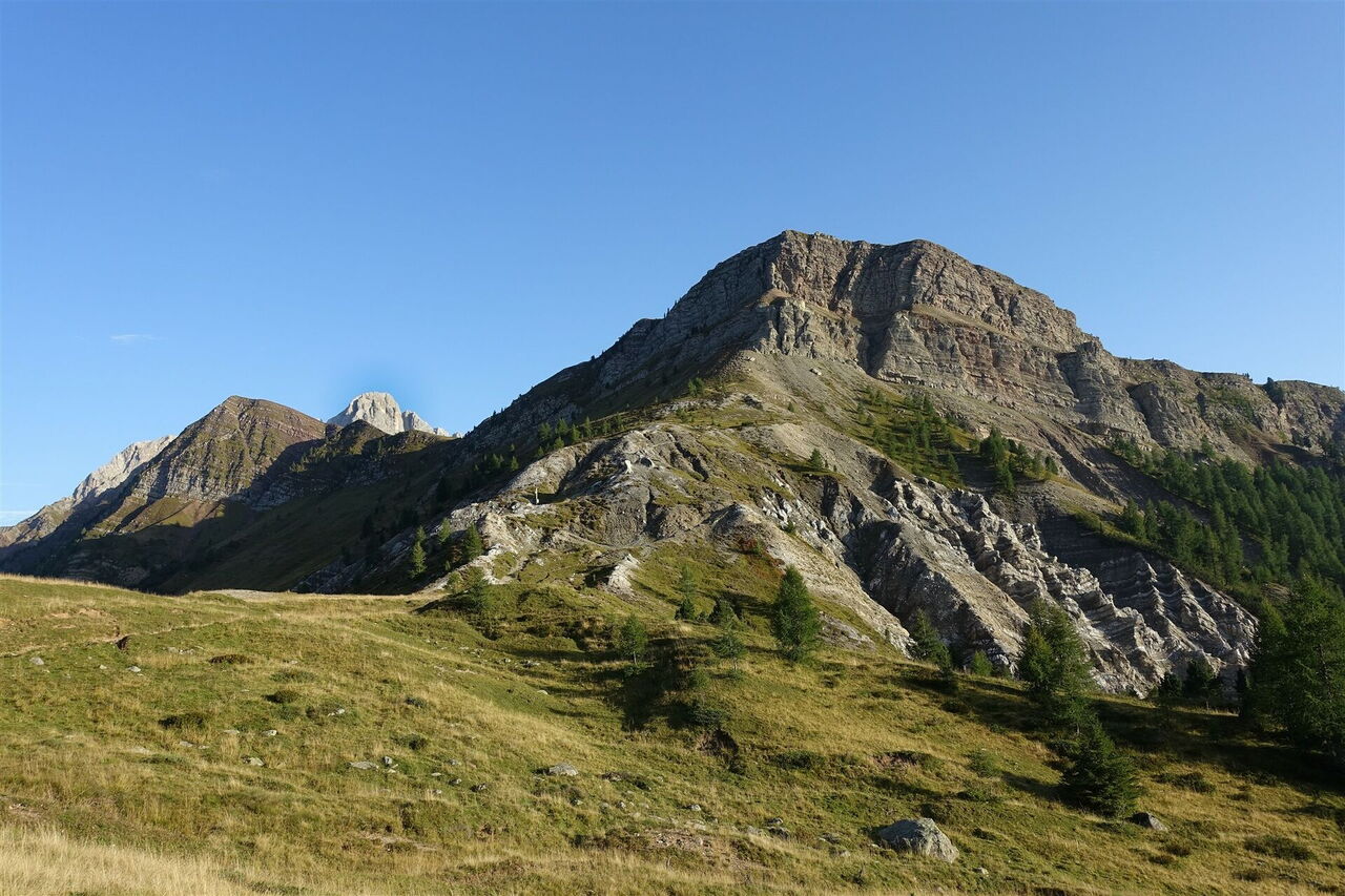 Nach kurzem Aufstieg gabelt sich der Pfad in zwei Arme, beide Wege sind zielführend. Wir erreichen die 02 Forcella Venegia (2.210 m) mit einem prachtvollen Blick auf die Palagruppe. An dieser Weggabelung mit einem Wegweiser gibt es die Möglichkeit, eine schöne Variante zu gehen. Anstatt dem Wanderweg 751 weiter zu folgen, überqueren wir die Forcella Venegia und gehen auf dem Wanderweg 749 durch Wiesen bergab, Richtung Pain della Vezzana. Den nachfolgenden rechten Abzweiger zur Malga Venegia ignorieren wir und bleiben auf dem Hauptweg.