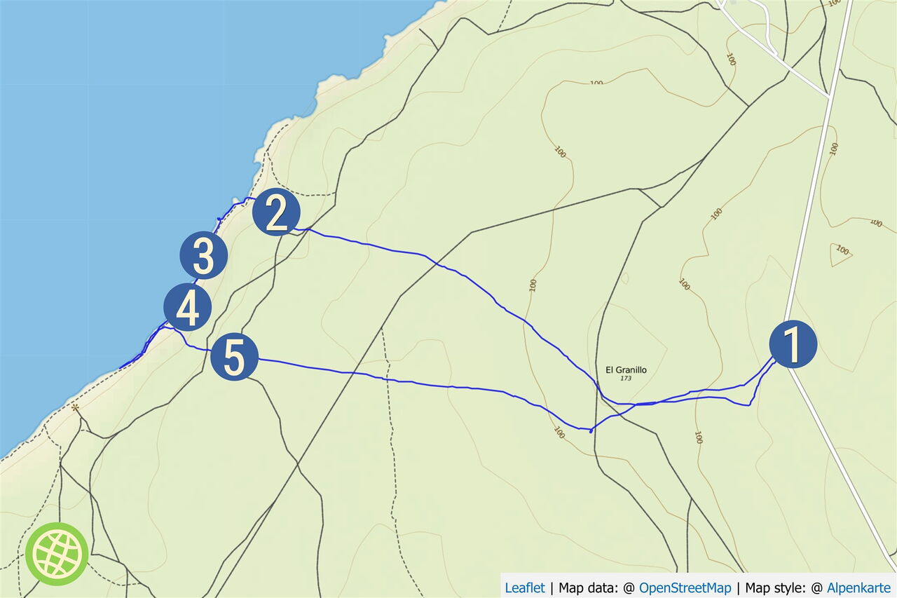 Wir starten die Wanderung in westlicher Richtung und gehen im 90°-Winkel zur Asphaltstraße, die auf den Hügel führt. Zuerst übersteigen wir weglos den vor uns liegenden Sandhügel. Schon bald können wir in der Ferne die Nordwestküste erblicken, die nach ca. 2,5 km Fußmarsch erreicht wird. Auf der Wanderung queren wir zahlreiche Pfade, die wir alle ignorieren. Da keine weiteren markanten Wegpunkte vorhanden sind, ist die Navigation nicht einfach. Wir steigen auf das untere Plateau direkt oberhalb des Meeresspiegels ab und gehen von dort aus links an der Küste entlang.