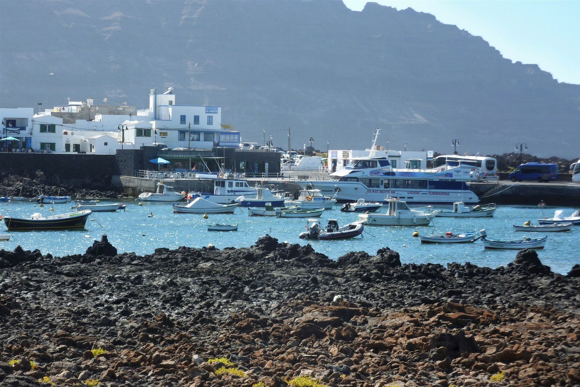 Vom 01 Start und Ziel 16 m, der Bushaltestelle in Orzola, gehen wir bis zur Hauptstraße vor und folgen dieser rechts in Richtung Hafen. Wir passieren einen Supermarkt, bis wir nach 250 m die Hauptstraße nach rechts verlassen. Auf der Asphaltstraße geht es vorbei an einer Bootslipanlage und alten Wasserauffangbecken bis zum Ende der Straße. Hier gehen wir scharf rechts, nun immer an der Küstenlinie entlang.