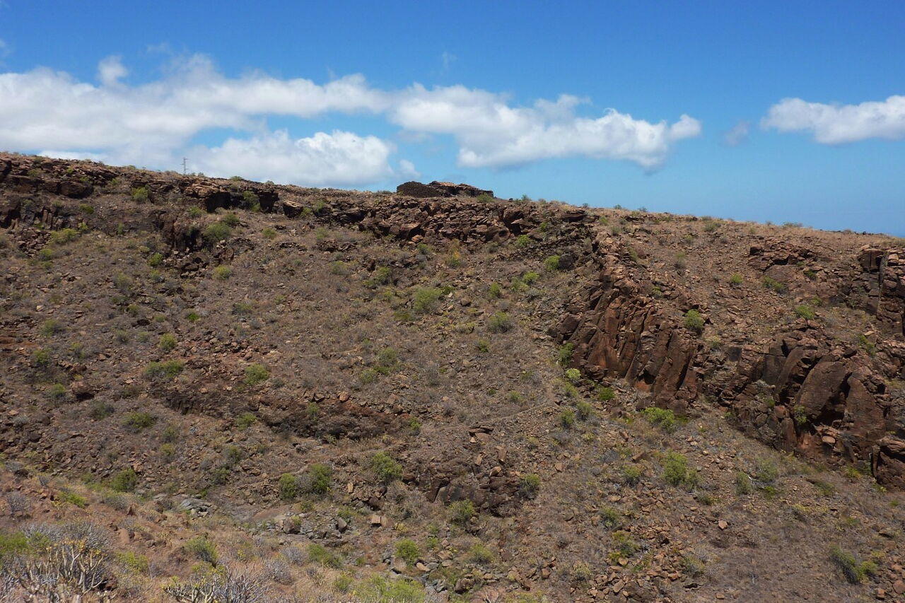 Am (01) Playa del Medio (5 m) verlässt am linken hinteren Ende des Parkplatzes ein steil aufsteigender Pfad die Bucht in östliche Richtung. Wir überschreiten die Punta del Joradillo und nach einem kurzen Abstieg erreichen wir den Playa de Chiriguarime. An seinem westlichen Ende gibt es einige sandige Stellen. Wir queren den Strand zu seinem östlichen Ende und gehen direkt auf eine kleine Ruine zu. Hinter dieser beginnt ein steil aufsteigender Pfad, der durch vereinzelte hellblaue Punkte markiert wurde. Auf dem Bergrücken angekommen, wandern wir kurzfristig auf dem oberen von zwei Küstenpfaden, orientieren uns dann aber im weiteren Verlauf an Steinmännchen.