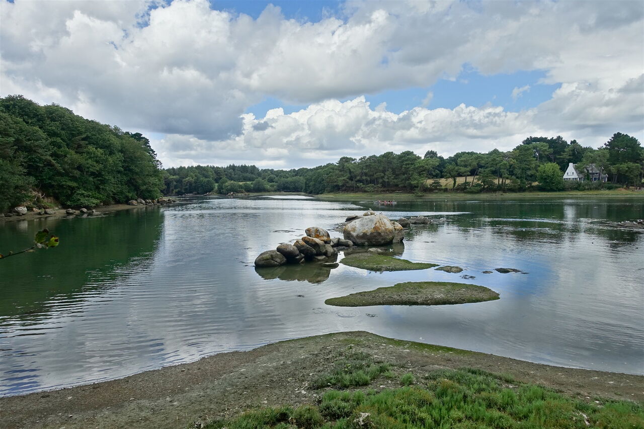 An der nachfolgenden Pfadgabelung gehen wir halb rechts, bei der darauffolgenden Gabelung halb links und wir überqueren eine kleine Holzbrücke. Große, ja riesige mit Moos bedeckte und rund geschliffene Felsen säumen den nachfolgenden Wanderweg, der an einer Straße endet. Auf der Route de Kerdruc gehen wir bis zur nachfolgenden Verkehrsinsel. Geht man dort geradeaus weiter, so gelangt man zum vorzüglichen Restaurant Le Bistrot de l'Écailler. Sonst gehen wir in die rechte der beiden Seitenstraßen – auch ausgeschildert Richtung Port Manec`h. Wir halten uns vor einem Steinhaus halb links, vor einem Haus mit einer Kieseinfahrt links und bei der nächsten Möglichkeit rechts, nun befinden wir uns auf einem Feldweg. Es folgt einer der landschaftlich schönsten Abschnitte der Wanderung entlang des Nebenarmes 04 Anse de Poulguin (8 m) mit vielen Wegverzweigungen: Wir queren eine Brücke über einen Bachlauf, ignorieren den rechten Abzweiger Richtung Kerochet und überqueren eine kleine Brücke. Bei einem hölzernen Markierungspfeiler kürzen wir die Strecke nach rechts ab. Der schmale Pfad endet und wir gehen links auf einem breiteren Pfad bis zu einer kleinen Brücke und einem riesigen Felsen. Weiter geht es wie folgt: Wir umlaufen die verschlungenen Ausläufer des Nebenarms des Flusses bis zu einer Fischerhütte, gefolgt von einer Zufahrtsstraße. Hinter einem Mauerdurchlass gehen wir rechts auf dem weiß-rot ausgekreuzten Pfad weiter. Bei einer hohen Mauer queren wir die Schotterpiste, gehen auf dem weiterführenden Pfad und kommen an einem Steinkreuz vorbei.