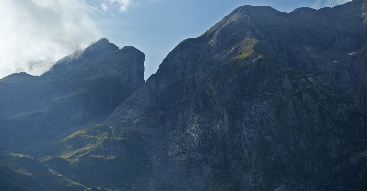 Wir erreichen die 02 Forcella La Varetta (1.704 m), rechts geht es zu der Casera La Varetta, wir gehen aber links Richtung Forcella del Marmol. Wir wandern auf einem extrem steil abfallenden, mit Gras bewachsenen Berghang. Unterhalb sieht man das Rifugio Furio Bianchet, direkt vor uns erhebt sich der mächtige Felskloß des 2.565 m hohen Schiara.