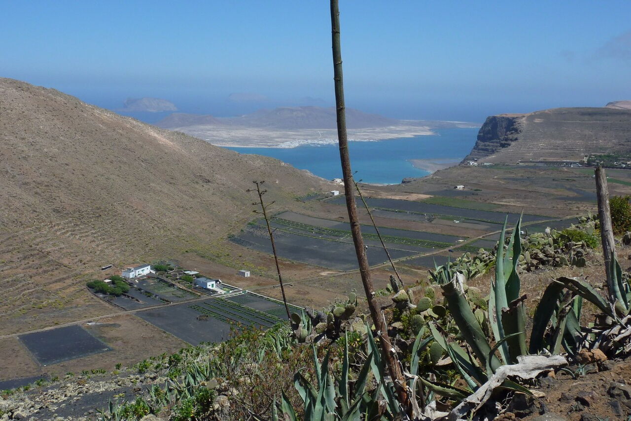 Parallel zu unserer Gratwanderung verläuft im Talgrund ein Wirtschaftsweg, zu dem wir im weiteren Verlauf der Wanderung absteigen werden. Der Pfad führt durch brachliegende, terrassenförmig angelegte Felder, bis wir nach einem kurzen Stück bergab den (03) Mirador (475 m) erreichen. Von diesem beeindruckenden Aussichtspunkt schaut man senkrecht zum Atlantischen Ozean herunter und entlang der Steilküste des Risco-de-Famara-Gebirgsmassivs. Vom Mirador steigen wir direkt zum Wirtschaftsweg ab und gehen dann rechts bergauf weiter.