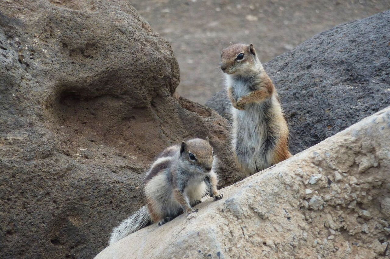 Nachdem wir das über uns liegende Hotel Club Paraiso Playa hinter uns gelassen haben, erreichen wir das Barranco Esquinzo. An diesem Wegpunkt bitte unbedingt ein wenig ins Barranco – bis zum Parkplatz – vorgehen, wo sich viele fast zahme Atlashörnchen angesiedelt haben. Das (03) Atlashörnchen (16 m) kam vor etwa 25 Jahren auf dem Schiffsweg nach Fuerteventura. Da es dort sehr ähnliche Lebensverhältnisse wie in Marokko vorfand, haben sich die anfangs lustigen Nager schnell zur Plage entwickelt.