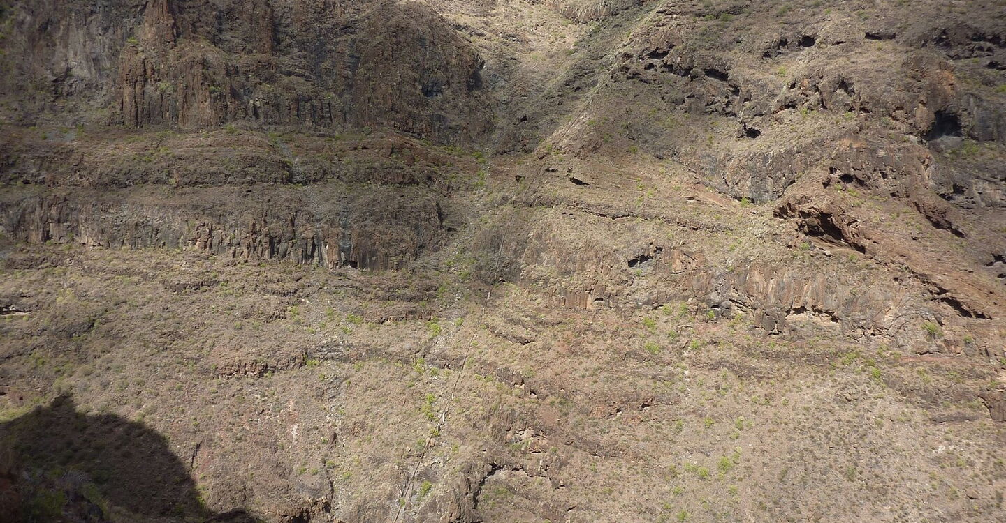 Vom (01) Start Ziel GM-3 (503 m) mit der kleinen Parkbucht steigen wir weglos über einen Sandhügel Richtung Meer, gehen ein kurzes Stück über in die Überreste von Terrassenfeldern. An der Schotterpiste angekommen gehen wir rechts in die Schlucht. Links von uns, gut 200 m tiefer gelegen, hat sich das Barranco Erese in die Natur erodiert.