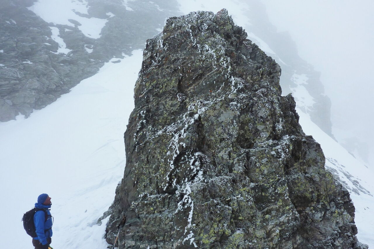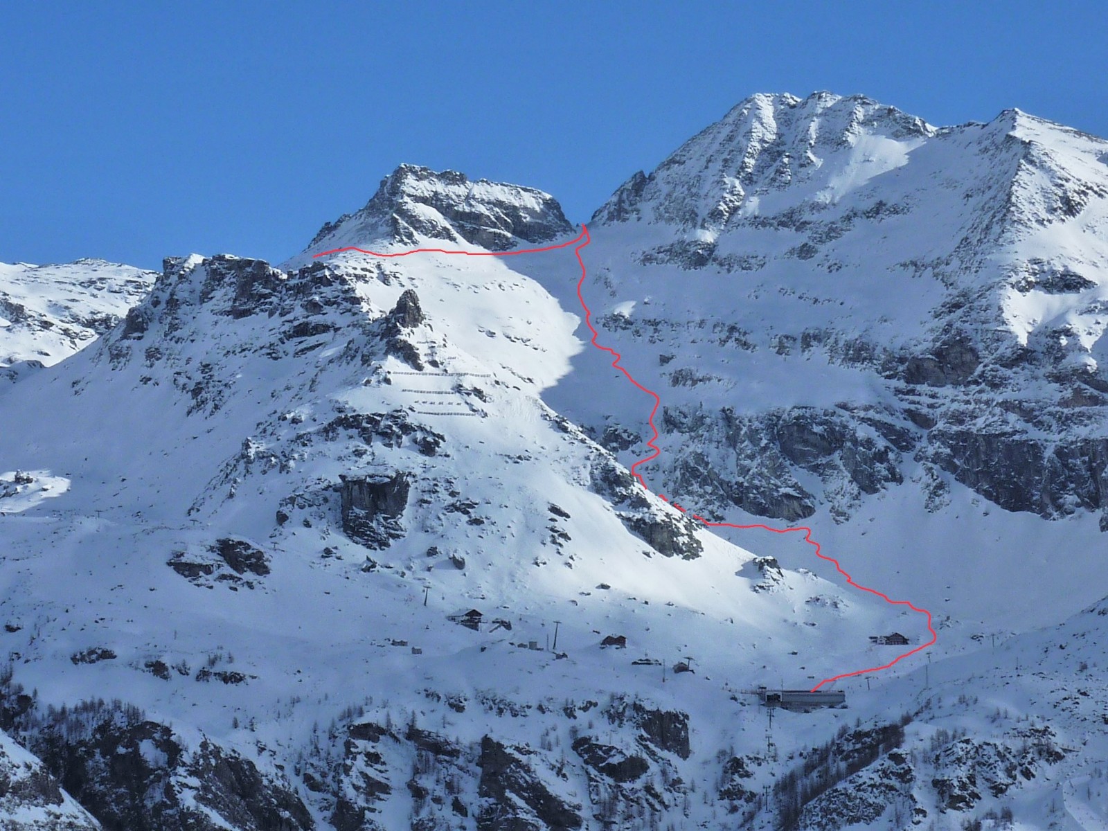 Einfache Abfahrt über den Gletscher. Bitte unbedingt die Absturzwarnung hinter dem Canyon beachten. Die Abfahrt führt über einen Westhang. Folgende Ausrüstung wird empfohlen: Produkte für alpine Sicherheit im Schnee, Tourenski und Skitourenhelm. Es gibt keine Einkehr auf der Tour. Außer man nimmt vor oder nach der Tour eine Stärkung in dem Rifugio Città di Vigevano. Beste Jahreszeit: Januar bis April. Uns erwarten kurze Stücke mit bis zu 30° Hangneigung.