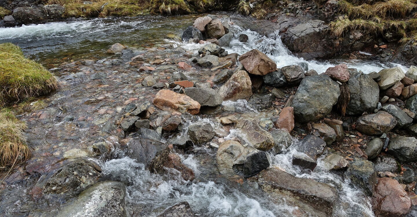 Wir erreichen die 04 Einsattelung (753 m) zwischen Stob Dubh und Stob Coire Raineach. Noch 20 m vor einem Haufen mit rotem Gestein befindet sich auf der rechten Seite der Einsattelung der Abstieg. Nach Regenfällen ist der Pfad gleichzeitig Bach und daher sehr matschig und auch schwer auszumachen. Als gedachte Wegmarkierung kann man links eines Bachlaufes gehen, der im Weiteren zum Bachlauf wird. Bald ist parallel zu diesem ein Pfad zu erkennen.