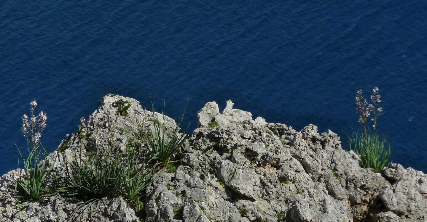 Wir erreichen die (02) Schlüsselstelle eins (12 m). Bei vertrockneten Bäumen führt ein Weg rechts zu den Häusern hoch, wir gehen aber halb links auf dem zunächst noch gut auszumachenden Küstenpfad. Es folgt ein wildromantisches, unberührtes wegloses Stück. Hier achten wir darauf, dass wir nicht zu dicht an die Klippe gelangen, aber auch nicht zu hoch ins Buschwerk kommen. Haben wir die Überreste eines Zaunes erreicht, so haben wir bereits einen steileren Klippenbereich umlaufen. Schlussendlich gelangen wir an einen intakten Ziegenzaun. An diesem steigen wir bergauf, um im oberen Bereich durch Gatter auf einen Pfad zu gelangen.