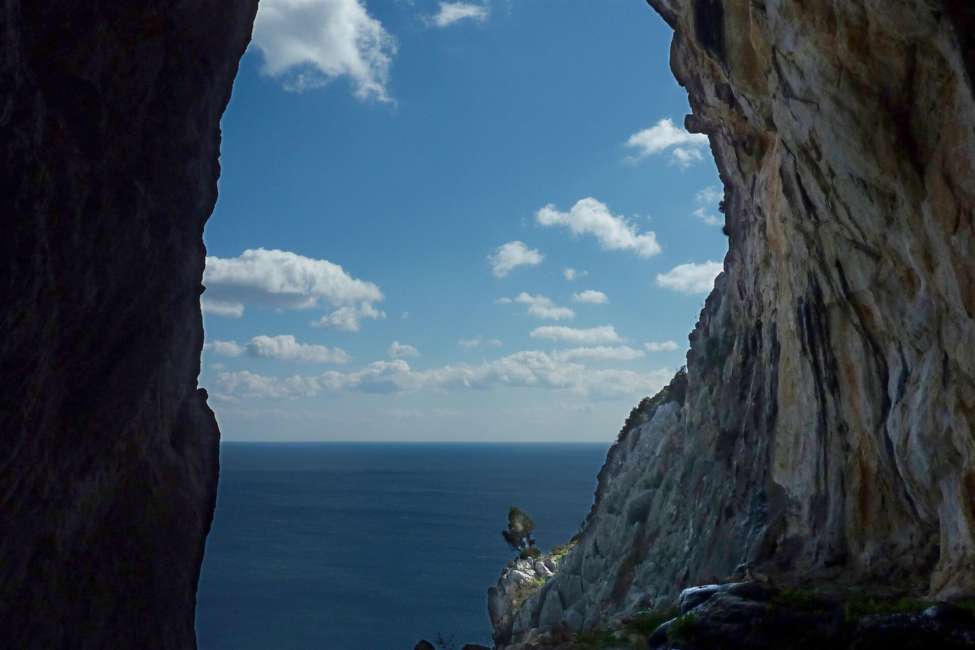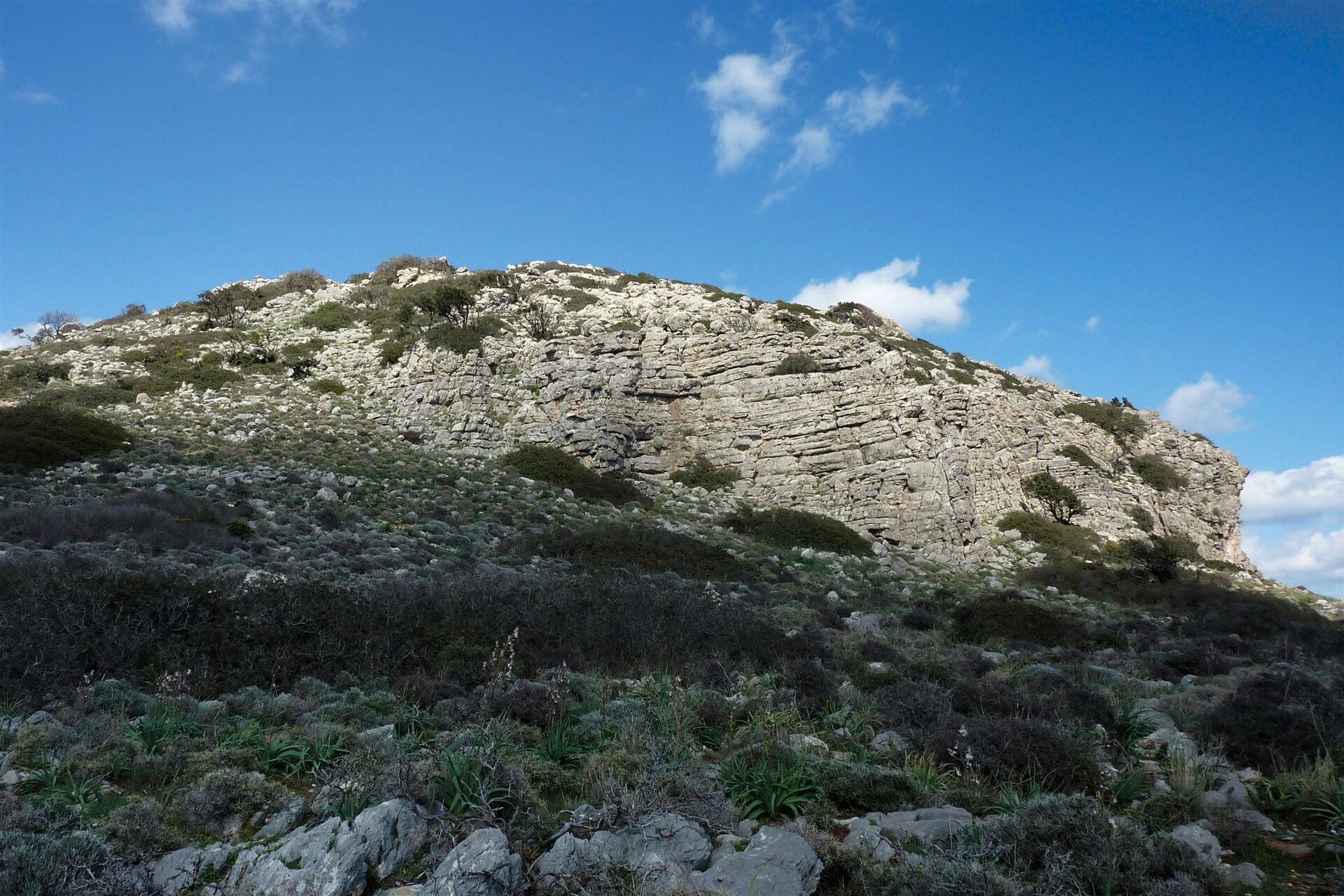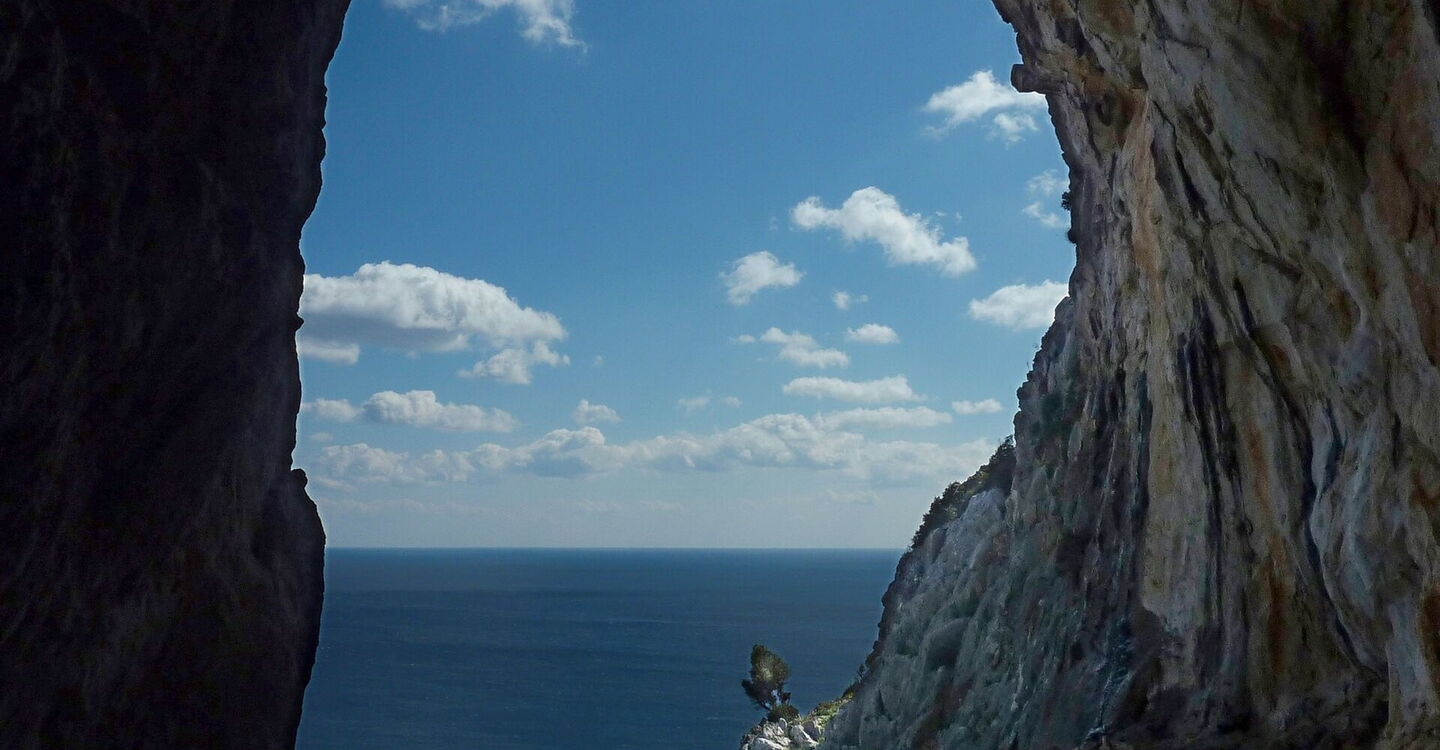 Gemächlich gewinnt der Pfad an Höhe, unterhalb der rechts von uns liegenden mächtigen Felswand. 330 m hinter dem Ziegengatter führt rechts bergauf ein Pfad zu einer großen offenen (03) Höhle (112 m) und Kletterstelle. Beim Anstieg wird etwas Kletterfertigkeit gefordert, um endgültig den großen Schlund der Höhle zu erreichen. Wir staunen über die atemberaubenden Ausblicke auf das tiefblaue Meer. Anschließend gehen wir zunächst auf dem gleichen Weg zurück, um dann unsere Wanderung auf dem eingeschlagenen Pfad fortzusetzen. Der Pfad ist nun nicht mehr so ausgeprägt, dafür helfen Steinmännchen bei der Orientierung. Die mächtigen Felswände liegen hinter uns und es ergibt sich ein wunderschöner Blick auf den langen Strand von Afandou.