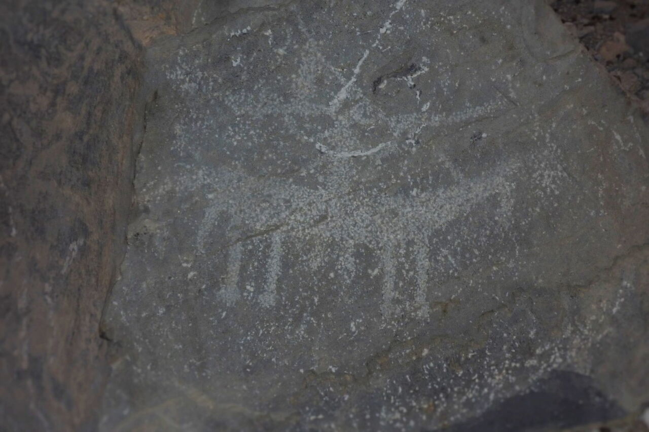 Genau auf der anderen Straßenseite, gänzlich unscheinbar und ohne Markierung, sind direkt am Straßenrand die 2.000 Jahre alten Felszeichnungen mit Tieren und Kriegern zu sehen.