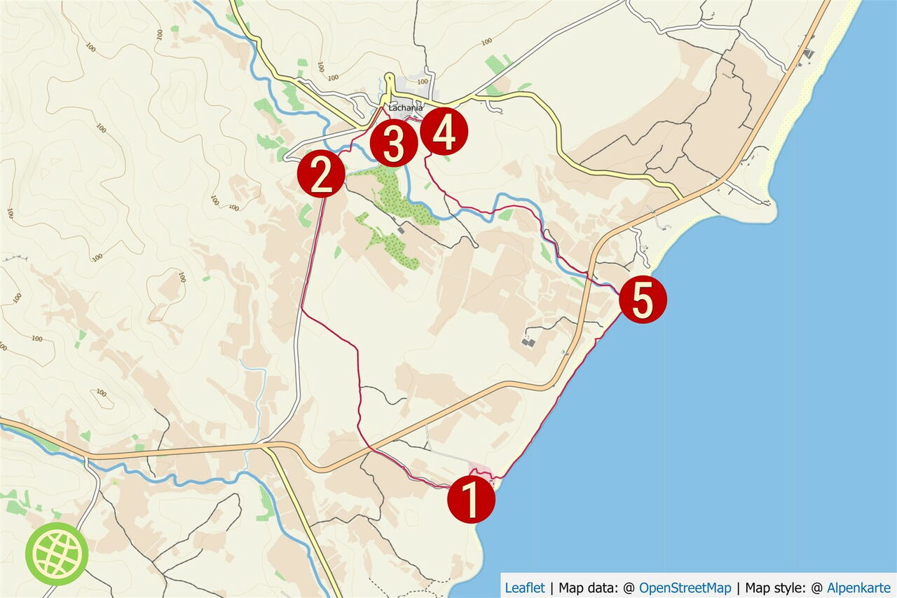 Wir biegen bei der nächsten Möglichkeit rechts in die Straße ab, die uns zum wunderschön restaurierten Dorf (03) Lachania (64 m) führt, das seinen alten Charme erhalten konnte. Besonders deutlich wird dies in der Taverne Platanos, idyllisch gelegen unter hohen Platanen neben der St.-George-Kirche. Vorbei am alten Brunnen gehen wir auf der leicht bergauf führenden Straße durch das Dorf, bis wir 50 m hinter dem Theofilos House – bei zwei hölzernen Strommasten – rechts in die Straße abbiegen.