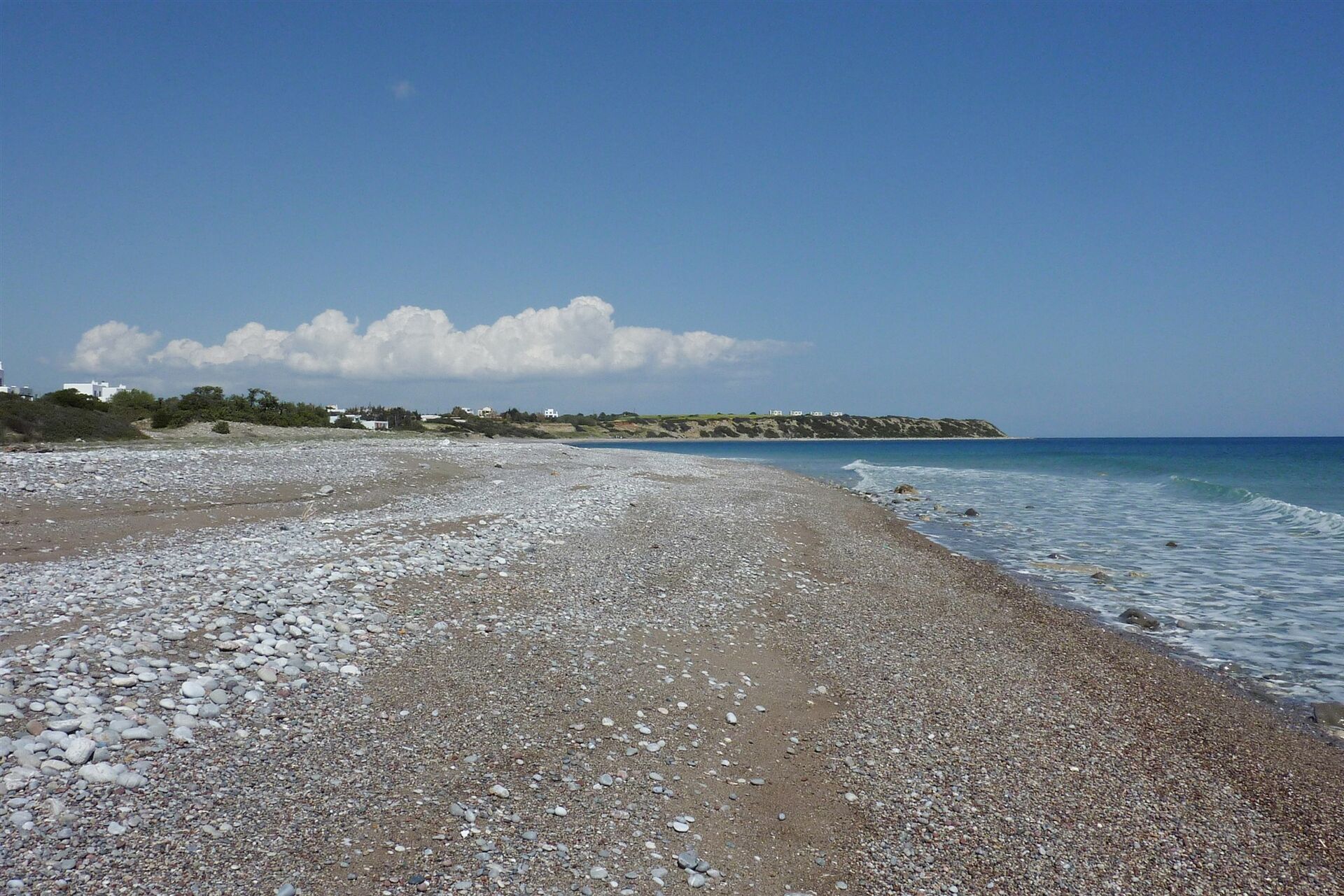 Hier unterqueren wir die Brücke weglos und gehen nun im Trockenflussbett, bis wir den (05) Strand von Lachania (1 m) erreichen. Es folgt ein astreiner Spaziergang an dem 1,7 km langen Kieselsteinstrand. Sobald wir auf gleicher Höhe mit den Flutlichtern für die Tennisplätze sind, gehen wir auf der bergauf führenden Piste oberhalb der Häuser des Thalasso Spa Resort – aber schon in der Anlage – bis zu unserem geparkten Pkw.
