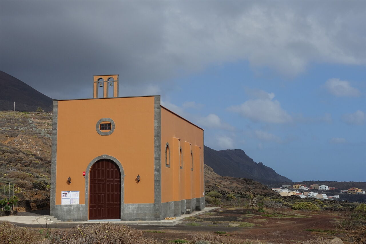 Mit Blick auf das imposante Postgebäude in (01) Valverde (589 m) gehen wir nach rechts und am Gebäude entlang, um bei dem grünen Treppengeländer die Stufen bis zur Straße herunterzugehen. Wir kommen an der kleinen Käsekuchenbäckerei vorbei, queren die nachfolgende Kreuzung und gehen nach 30 m bei der Weggabelung halb rechts – auch ausgeschildert Richtung La Caleta. Auf der Straße zum Flughafen und zum Hafen angekommen, gehen wir 100 m rechts, um dort bei dem Zedernwacholderbaum links auf eine Piste zu gelangen. Diese verlassen wir sofort wieder nach links, bevor die Piste wieder zur Straße hochführt. Vorbei geht es an einem Wassertank und entlang einer oberirdisch verlegten Wasserleitung. Wir überqueren eine weitere, etwas dickere Wasserleitung und gehen hier geradeaus weiter.