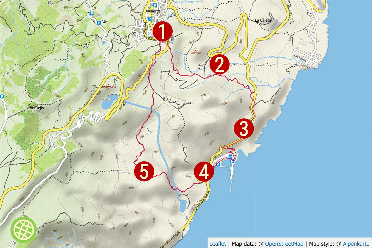 Mittelschwere Wanderung mit vielen Höhenmetern. Art des Weges: 10 % Straße, 20 % Pfade und 70 % Camino. Zusatzausrüstung: keine. Einkehrmöglichkeit: keine auf der Wanderung. In Valverde gibt es viele Restaurants. Beste Wanderzeit: ganzjährig. Interessantes: Der Pfad führt vorbei am unteren Wasserreservoir und den fünf Windrädern des Wind-Wasserkraftwerks.