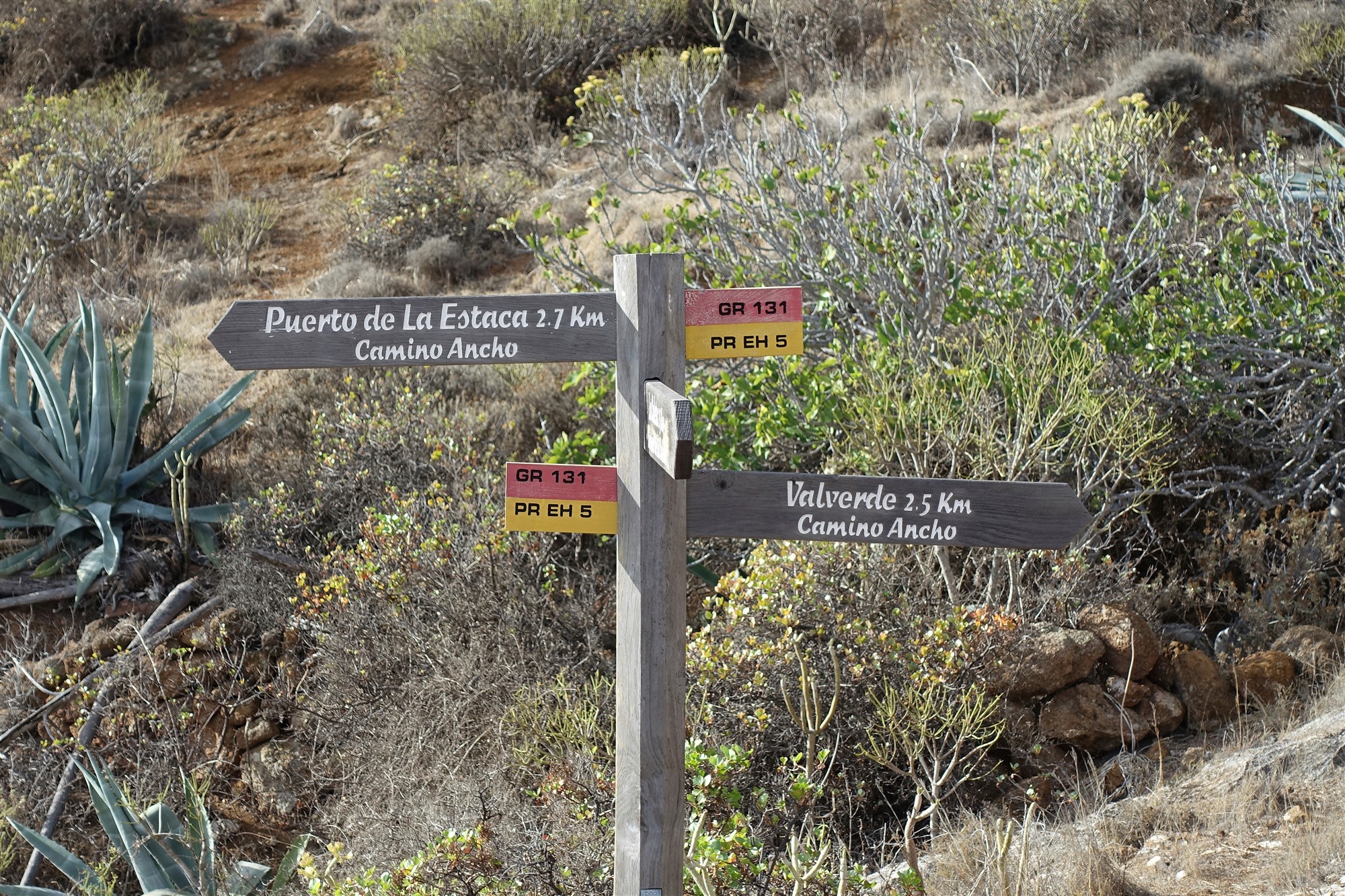 Vom (01) Busbahnhof (616 m) in Valverde gehen wir zur Hauptstraße zurück. Wir gehen weiter auf der ortsauswärts führenden Straße Richtung San Andres und verlassen diese auch gleich wieder nach links, ausgeschildert Richtung Parque Eolico und einige Meter weiter Richtung Puerto de La Estaca. Der Abstieg erfolgt auf dem sogenannten Camino Ancho.